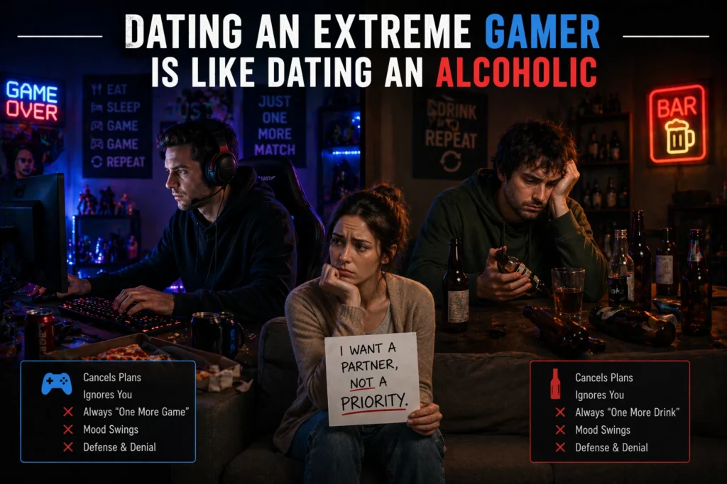 That said, just like there’s a difference between someone who drinks and an alcoholic, there’s a difference between someone who plays video games and “a gamer.” And, I’ve dated all sorts — people who drank responsibly, people who were (in my estimation) alcoholics, people who video gamed responsibly, and people who were (in my estimation) video gaming self destructively. Where does the line get crossed?